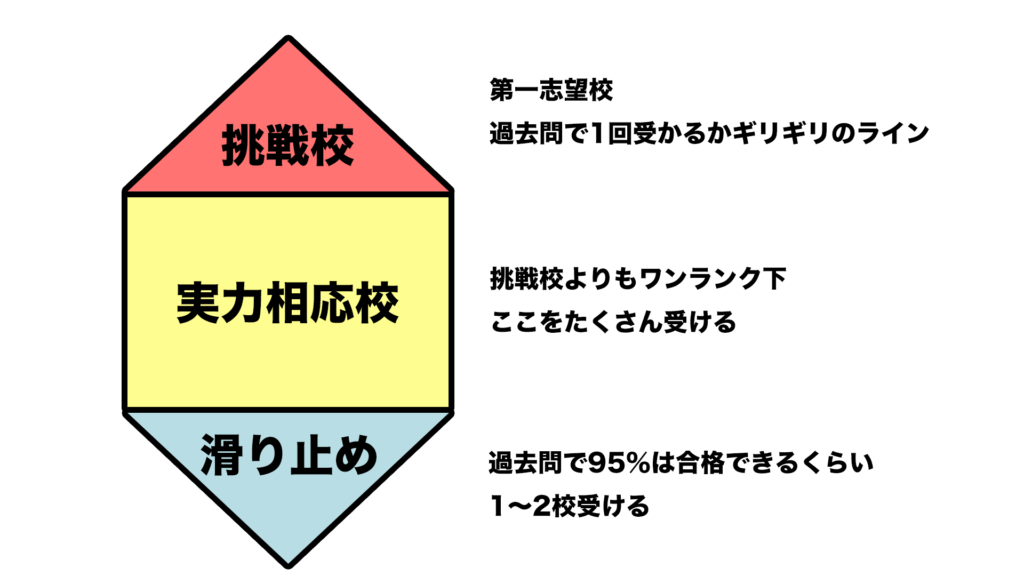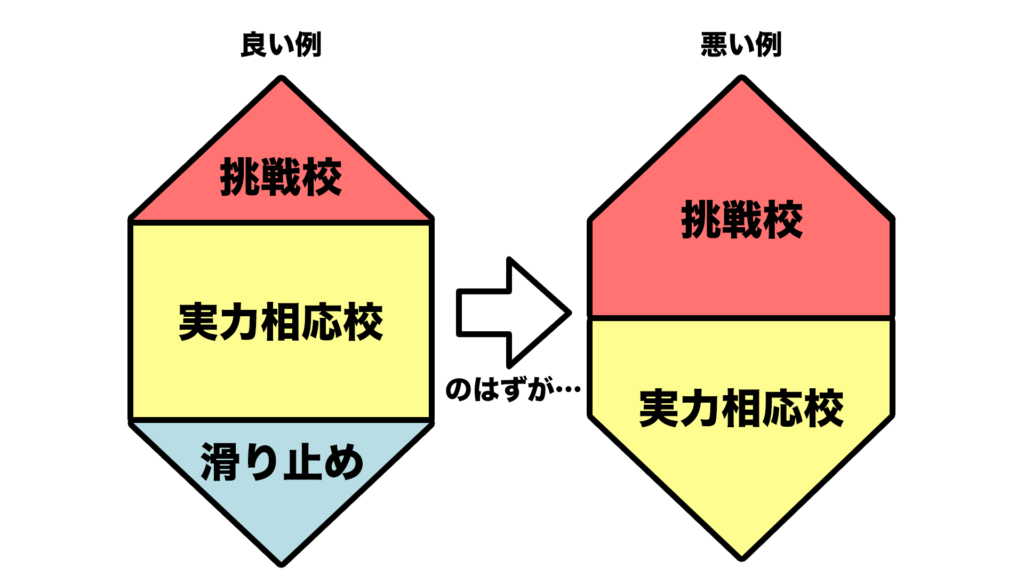 “縦割り”とは、第一志望(挑戦校)・実力相応校・安全校をバランスよく組み合わせること。「全部ダメだった…」とならないように、合格を確実に取れるラインも入れておくことが安心です。