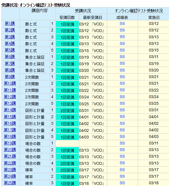 「数ⅠAは」4/10に受講を終えています。