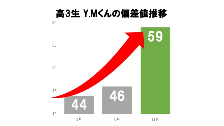 彼はAクラス文系に進み、英検準1級を獲得。東進模試でも偏差値60まで上がった。